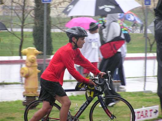 Volunteer Kylie Donia off the bike and heading for the pool. "So it's raining. So what? Gonna get wet anyway."