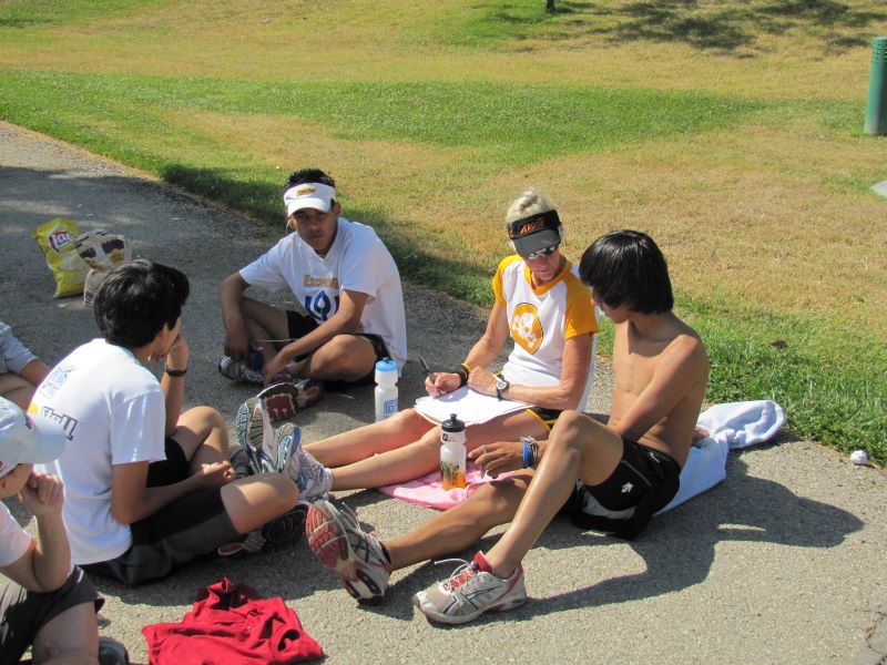 EE-June-2010 -- Cherie meets with the three oldest team members to update training plans for their Big One: The SOMA half Ironman in October.