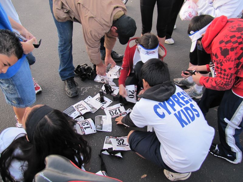 Redlands -- A solution to the usual registration chaos: "Everybody find your own race number and timing chip!"