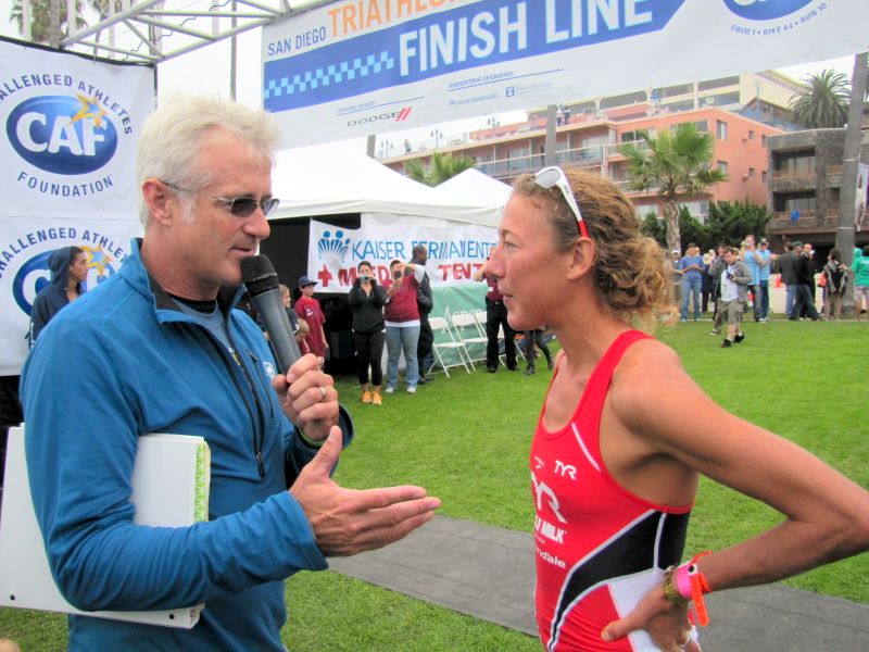 CAF-2011 -- Announcer Eric Gilsenan with Chrissie at the finish line