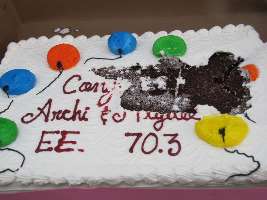 Training-awards-7-31-2011 -- A slight transportation mishap obliterated part of the messsage: Congratulations to Archi and Miguel, first two EE team members to complete an official 70.3 (half-Ironman) race at Vineman. We showed you those pictures last week.