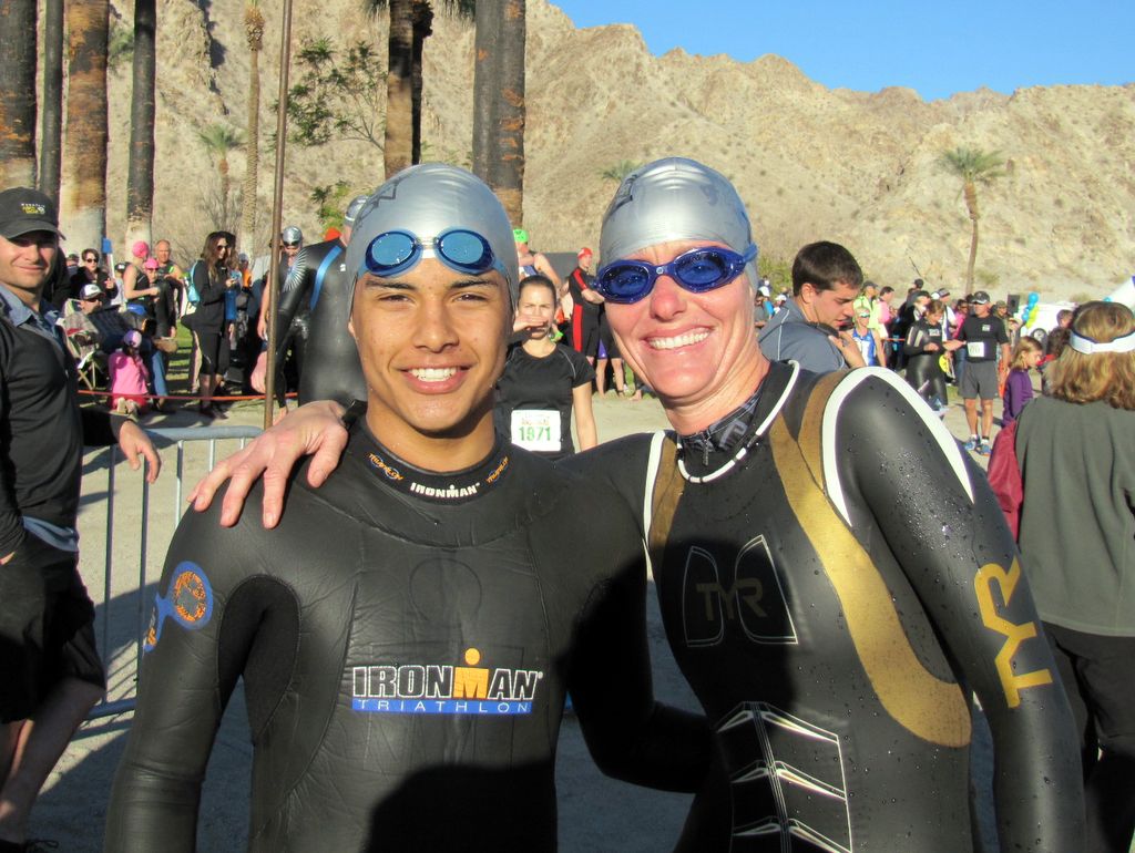 Desert-Tris-2013 -- Josh has other things on his mind, like getting his picture taken with former Ironman World Champion and Olympic silver medalist Michellie Jones.