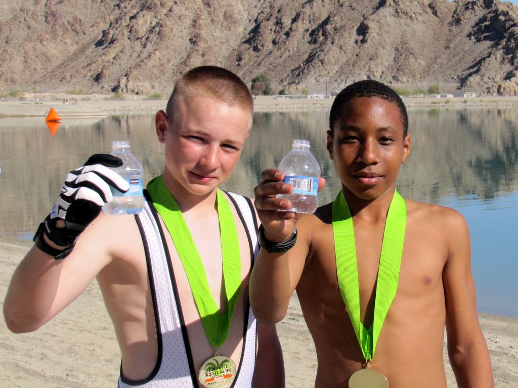 Desert-Tris-2013 -- Gary and Jamaje honing their future endorsement skills. "It's not just any water...it's free bottled water!"