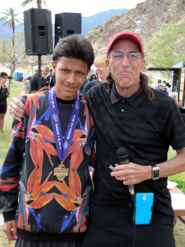 Desert-Tri-2014 -- John being congratulated by race announcer Alan Woodruff on his first place finish