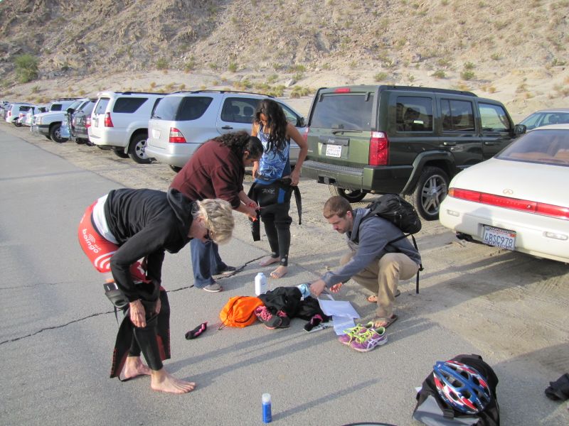 Desert-Tri-2014 -- Suiting up. Mom Teresa helps Ana as Brad sorts out the gear