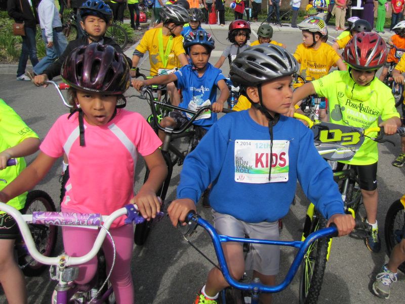 PossAbilities-2014 -- Karen and Eduardo at the start of the Kids Tri. All of the EE kids in this event did the 5K as well. Eduardo has spotted a competitive threat...