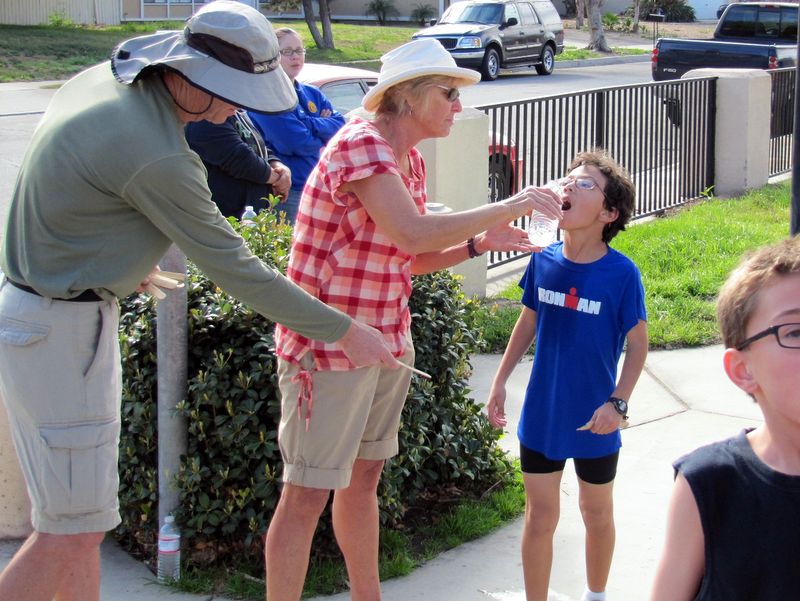 Swimathon-Runathon-2014 -- Cherie's brother Larry hands out lap-counting sticks as wife Susan force-feeds water.